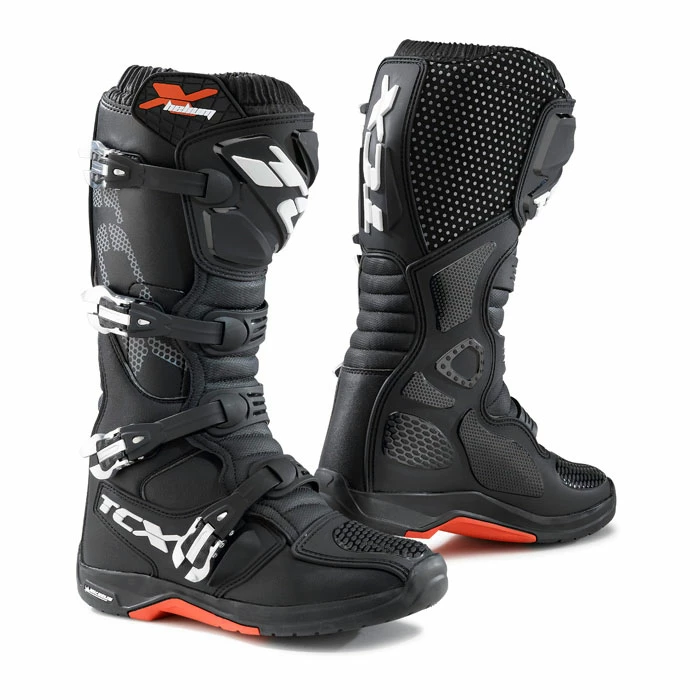 Tcx X-HELIUM MICHELINยฎ boot, middle of the range in the off-road line, is fitted with the new MICHELINยฎ MX Hybrid sole which stands out for its specific design that affords maximum grip, traction and stability. The special mixture used to produce it makes it highly resistant to abrasions and tears. UPPER: microfibre, padded front and ankle area. LINING: AIR TECH breathable. REINFORCEMENTS: inside microfibre heat guard, shin plate, polyurethane heel and ankle guard, polyurethane toe guard. BUCKLES: aluminium buckles, new ergonomic design, micro adjustable and replaceable. SOLE: MICHELIN MX Hybrid sole.